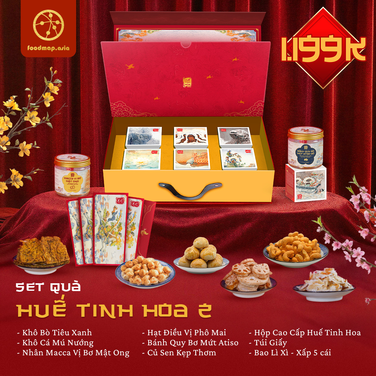 SET QUÀ HUẾ TINH HOA 2 là bộ quà Tết cao cấp quy tụ các đặc sản Huế & đặc sản Việt chọn lọc, kết hợp hài hòa giữa món mặn đậm vị, hạt dinh dưỡng và bánh mứt tinh tế. Set quà mang tinh thần trang nhã – sâu lắng – vinh hoa, phù hợp làm quà biếu doanh nghiệp, đối tác và khách hàng quan trọng trong dịp Tết Nguyên Đán.